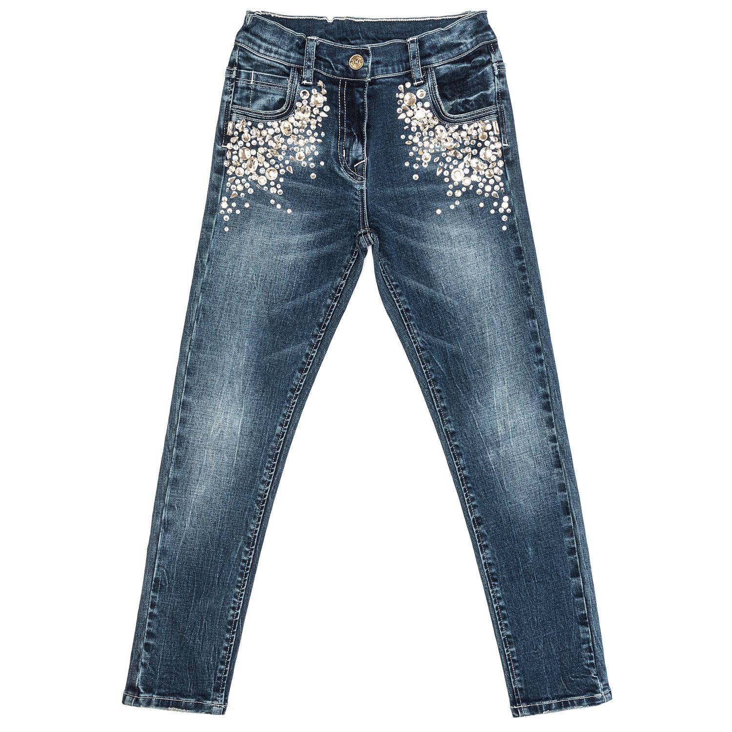 Jean super stretch en version luxe, avec cascades de cristaux sous les poches